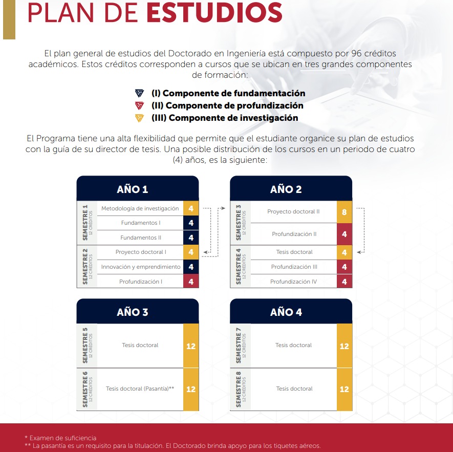 El plan general de estudios del doctorado en Ingeniería está compuesto por 96 créditos académicos. Estos créditos corresponden a cursos que se ubican en tres grandes componentes de formación: